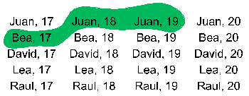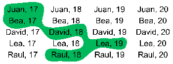 \[\begin{align*}E\times F =&\{(Juan,17),(Juan,18),(Juan,19),(Juan,20)\\&(Bea,17),(Bea,18),(Bea,19),(Bea,20) \\&(David,17),(David,18),(David,19),(David,20) \\&(Lea,17),(Lea,18),(Lea,19),(Lea,20) \\&(Raul,17),(Raul,18),(Raul,19),(Raul,20)\}\end{align*}\]