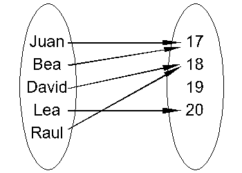 La relación "le gusta el número" tiene muy pocas propiedades interesantes. Por lo tanto vamos a ver otra que sí tiene una propiedad interesante y es a relación "tiene la edad de". Suponiendo que Juan y Bea tienen 17 años, David y Raul tienen 18 y Lea 19, vamos a definir la relación Re que denominamos "tiene la edad de" a partir del subconjunto de ExF llamado "grafo de Re": GRe = {(Juan,17),(Bea,17),(David,18),(Lea,19),(Raul,18}. Esta relación tiene una peculiaridad que la hace interesante y es que todos los elementos de E estan relacionados como mucho con un elemento de F. Es decir que nadie tiene dos edades distintas. A partir de esta relación funcional es posible definir una función sobre el conjunto E a valores en F, que a cada elemento de E asocia como mucho un elemento F. Y esta es la definición de una función. Si la función se nota "f", "17" se nota "f(Juan)" y se llama "imagen de Juan", mientras "Juan" sería un antecedente de "17". El conjunto de los elementos que tienen una imagen se llama dominio de la función. Notese que en el dominio se habla de LA imagen de cada elementos porque siempre hay una sola, mientras que cuando lo hay, se habla de UN antecedente de un elemento de F porque podría haber otros. "17" tiene dos antecedentes, "20" no tiene ninguno. Una aplicación entre dos conjuntos E y F es una función para la cual todos los elementos de E tienen una imagen, es decir que se habla de una aplicación cuando el dominio de la función es E.