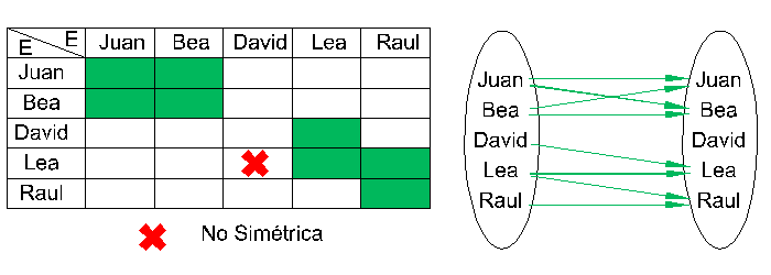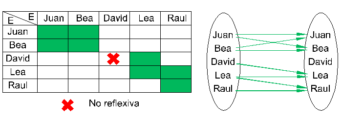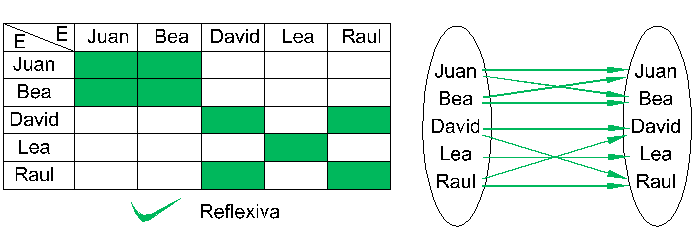 Supongamos que E=F trabajamos por lo tanto sobre el conjunto E. En este caso la relación es "reflexiva" significa que para cualquier "e" de E, resulta que "e" está en relación con él mismo: e R e. Por ejemplo, la relación "tiene la misma edad que" es obviamente reflexiva: Juan tiene la misma edad que... Juan! En cambio, la relación "quiere a" que notamos Rq definida por su grafo: GRq = {(Juan,Juan),(Juan,Bea),(Bea,Bea),(Bea,Juan),(David,Lea),(Lea,Lea),(Lea,Raul),(Raul,Raul)} no es reflexiva porque no todo el mundo tiene la autoestima suficiente como para quererse a sí mismo: David no se quiere a sí mismo.
