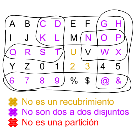 Por ejemplo, si \(E=\{A,B,C,D,E,F\}\), \(P_{1}=\{\{A,B,C,D\},\{C,D,E\},\{A,E,F\}\}\) es un recubrimiento de \(E\), pero \(P_{2}=\{\{A,B,C\},\{C,E\},\{A,E,F\}\}\) no lo es porque ningún elemento de \(P_{2}\) contiene el elemento \(D\).