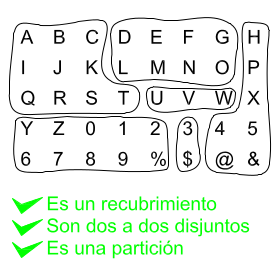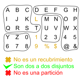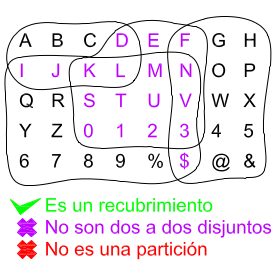 Una partición es un recubrimiento que tiene la particularidad de que ninguno de sus elementos es el conjunto vacio, y sus elementos son todos disjuntos dos a dos, es decir que la intersección entre sí de cualquier par de elementos del recubrimiento es el conjunto vacio salvo evidentemente que cojamos dos veces el mismo elemento: