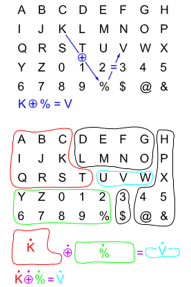 A la derecha se representa gráficamente una definición de \(\dot{\oplus}\) en la que simplemente se ha establecido que \(\dot{x}\dot{\oplus} \dot{y}=\dot{\overline{x \oplus y}}\), lo cual es bastante habitual si en vez de buscar ampliar \(E\) con \(F=E^{2}\) se ha escrito simplemente \(F=E\) (Ver primeros dos ejemplos abajo). Lógicamente es necesario comprobar que el resultado no depende de los representantes elegidos es decir que por ejemplo si hubieramos elegido "\(J\)" y "\(9\)" en vez de "\(K\)" y "\(\%\)", tendríamos por decir algo \(J \oplus 9=U\) y por lo tanto \(\dot{K} \dot{\oplus} \dot{\%} = \dot{J} \dot{\oplus} \dot{9} = \dot{U}=\dot{V}\).