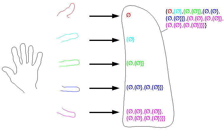 Como base preliminar, afirmo que ningún natural es equipotente a otro natural distinto. Es decir que no existe ninguna biyección entre dos conjuntos del tipo \(\{\emptyset,\{\emptyset\},...\}\) salvo que dichos conjuntos sean iguales. Puede parecer una obviedad pero no lo es tanto. Un conjunto puede incluir a otro "sobrandole" elementos y poder todavía establecer una biyección entre ambos conjuntos. A modo de ejemplo, \(\mathbb{N}\subset\mathbb{Z}\) y \(\mathbb{N}\neq\mathbb{Z}\) y no obstante existen biyecciones entre \(\mathbb{N}\) y \(\mathbb{Z}\), son conjuntos equipotentes (leer sobre el famoso hotel de Hilbert...).