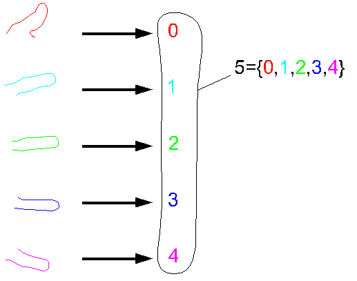 El matemático alemán Fredge propusó la definición de los naturales como cardinales. Estableció una relación de equivalencia \(R\) entre los conjuntos de forma que dos conjuntos \(E\) y \(F\) estan en relación si y solo si existe una biyección entre estos conjuntos. Dicho de otros modo, \(E\) y \(F\) estan en relación si y solo si son equipotentes (Ver apartados Razonamiento/Relaciones/Relación de equivalencia y Razonamiento/Relaciones/Aplicaciones de esta web).