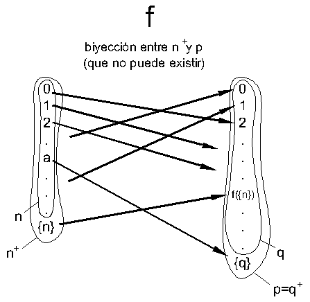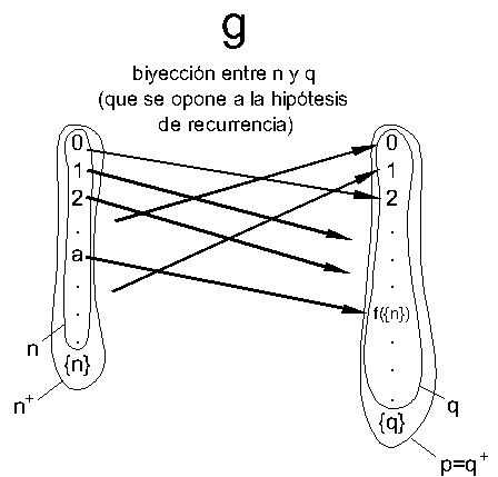 Por lo tanto \(g\) es biyectiva de \(n\) a valores en \(q\) y esto es un absurdo ya que se contradice con la hipótesis inductiva que dice que hasta el natural \(n\) (incluido) ningún natural es equipotente con ningún otro natural distinto. Por lo tanto no existe una biyección entre \(n^+\) y \(p\) y ha quedado demostrado la propiedad para el sucesor de \(n\) y por inducción para todo natural.