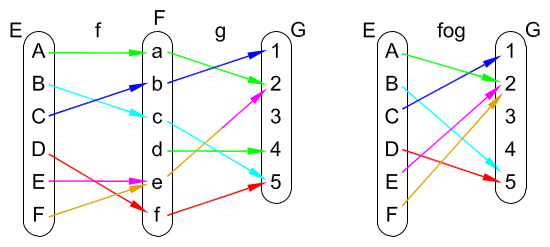 Es posible componer dos aplicaciones y lograr una tercera. Supongamos que disponemos de tres conjuntos (no necesariamente distintos entre sí) que notamos \(E\), \(F\) y \(G\). Disponemos también de dos aplicaciones \(f\) y \(g\). \(f\) es una aplicación de \(E\) a valores en \(F\) y \(g\) es una aplicación de \(F\) a valores en \(G\). Es posible obtener una aplicación \(h\) de \(E\) a valores en \(G\) que a todo elemento de \(E\) asocia la imagen por la función \(g\) de su imagen por la función \(f\):