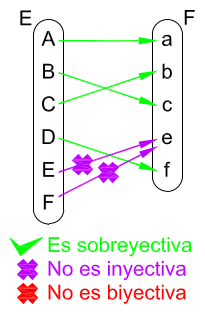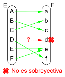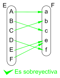 Se dice de una aplicación \(f\) de \(E\) a valores en \(F\) que es sobreyectiva cuando su recorrido es \(F\), es decir que cualquier elemento del conjunto \(F\) tiene al menos un antecedente.