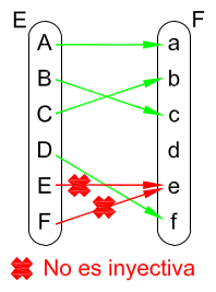 Se dice de una aplicación \(f\) de \(E\) a valores en \(F\) que es inyectiva cuando ningún elemento de \(F\) tiene mas de un antecedente. Formalmente, se escribe que si dos elementos de \(E\) tienen la misma imagen (es decir que son antecedentes de un mismo elemento de \(F\)), entonces estos dos elementos son iguales entre sí:
