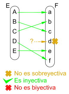 \[f \, es \, inyectiva \; \Leftrightarrow \; (\forall (x_{1},x_{2}) \in E^{2}, f(x_{1})=f(x_{2}) \Rightarrow x_{1}=x_{2})\]Cuando dos conjuntos \(E\) y \(F\) tienen la propiedad de que existe una aplicación inyectiva de \(E\) a valores en \(F\), se dice que \(E\) es subpotente a \(F\).