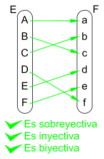 Se dice de una aplicación \(f\) de \(E\) a valores en \(F\) que es biyectiva cuando es a la vez sobreyectiva e inyectiva. Es decir que cada elementos de \(F\) tiene un antecedente y uno solo:\[f \, es \, biyectiva \; \Leftrightarrow \; \forall y \in F, \exists! x \in E / f(x)=y\]