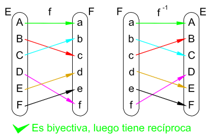 Notese que sólo se habla de recíproca cuando una aplicación es biyectiva. En efecto, si \(f\) no fuera inyectiva, un mismo elemento de \(F\) podría tener varios antecedentes llevando a una indefinición de \(f^{-1}\). Por otra parte para hablar de recíproca es preciso en su caso reducir \(F\) de tal forma que \(f\) sea sobreyectiva sobre \(F\). Si \(f\) no fuera sobreyectiva existirian elementos de \(F\) sin antecedentes por lo que \(f^{-1}\) no estará definida sobre todo \(F\) (sería una función, no una aplicación).